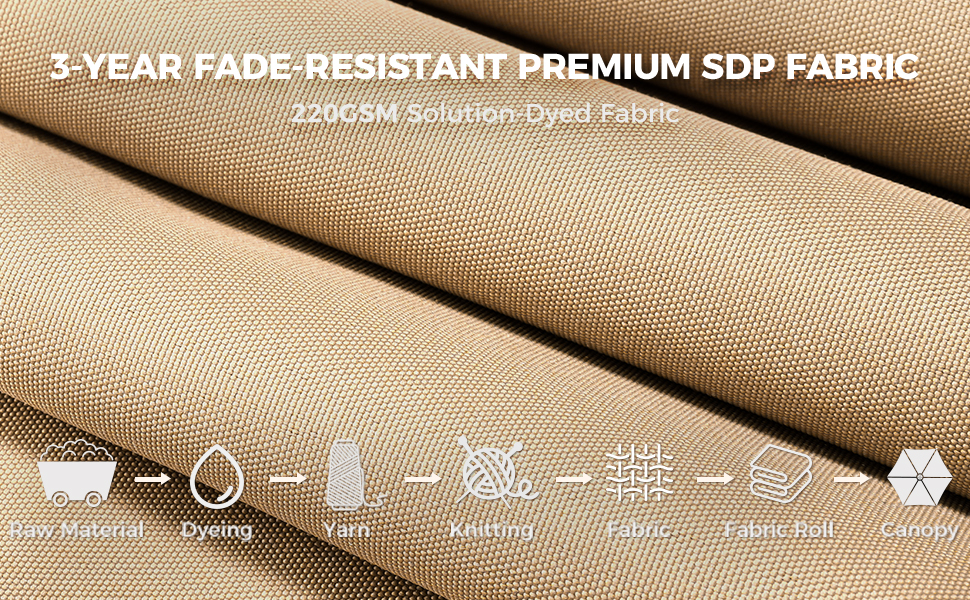 The canopy is made from high-quality 220 gsm fabric, ensuring it's sun-proof and built for outdoor use. And the color stays vibrant for a good 3 years.