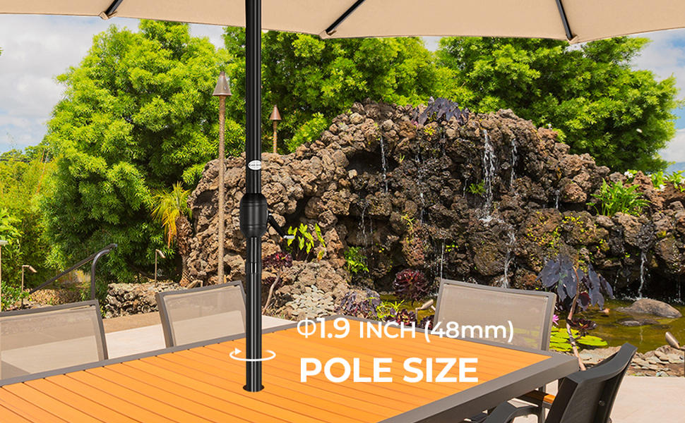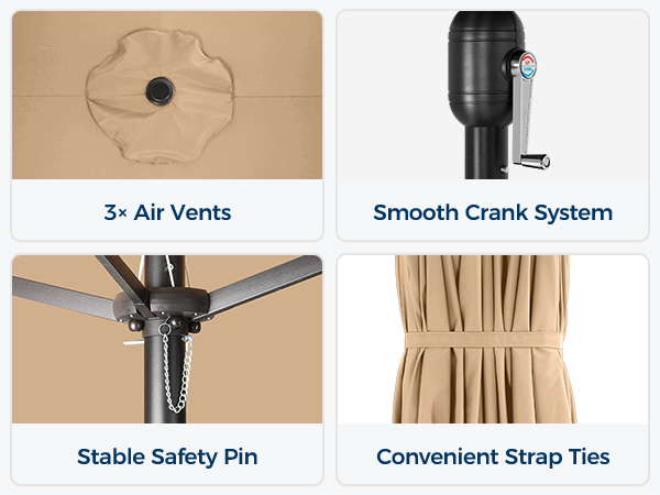 The heavy-duty ribs are 20% thicker (12x18mm), providing extra stability for the patio umbrella even in strong winds of up to 30 MPH. The double powder-coated steel alloy surface ensures rust resistance, extending the umbrella's lifespan.
