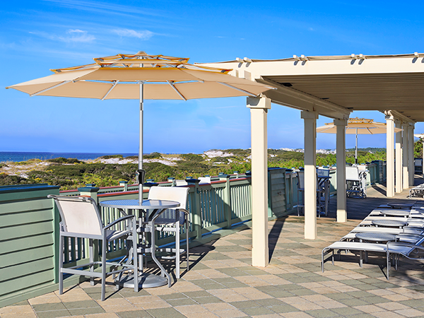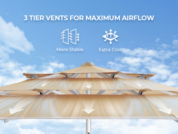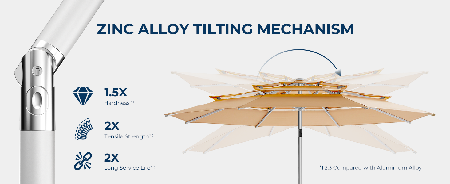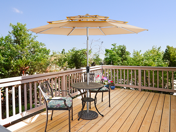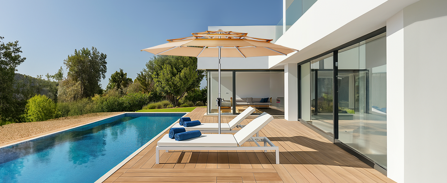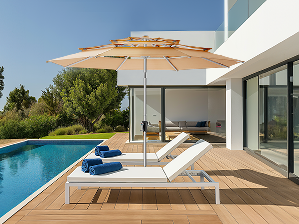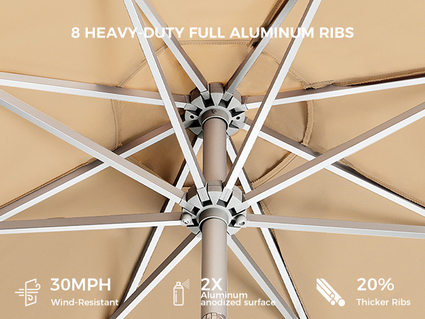 High-quality full-aluminum patio umbrella with anodized surface. 260GSM solution-dyed polyester like Sunbrella. Beautiful, high-end, durable, windproof, rustproof. Ideal for high-end markets, pools, windy/hot locations.