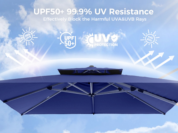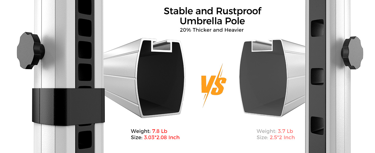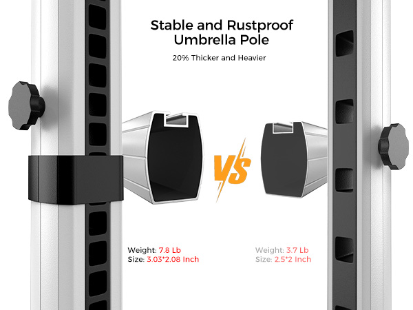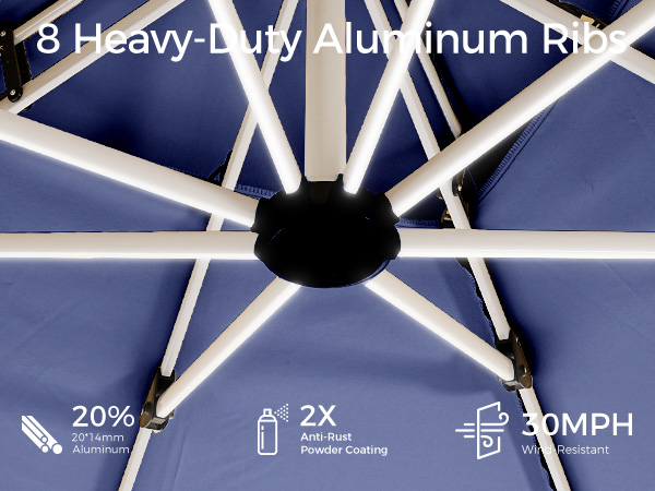 The heavy-duty aluminum ribs are 20% thicker (20x14mm), providing extra stability for the patio umbrella even in strong winds of up to 30 MPH. The double powder-coated steel alloy surface ensures rust resistance, extending the umbrella's lifespan.